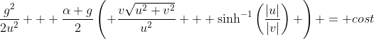 Proviamo a leggerla, consci che senza un articolo a corredo c'è sempre la possibilità di fraintendere: g è la componente della forza di gravità, u e v le componenti di un vettore bidimensionale – ovvero la velocità verticale e orizzontale –, la lettera greca alpha apparentemente un parametro che tiene conto dell'attrito e sinh, di cui si considera l'inverso, è la funzione "seno iperbolico" (che i più smaliziati sapranno essere in relazione con la funzione esponenziale).
